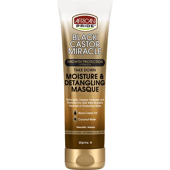 African Pride® Black Castor Miracle Moisture & Detangling Masque softens, conditions and removes knots/ buildup from dry, tangled hair after braided, weaved and protective styles.