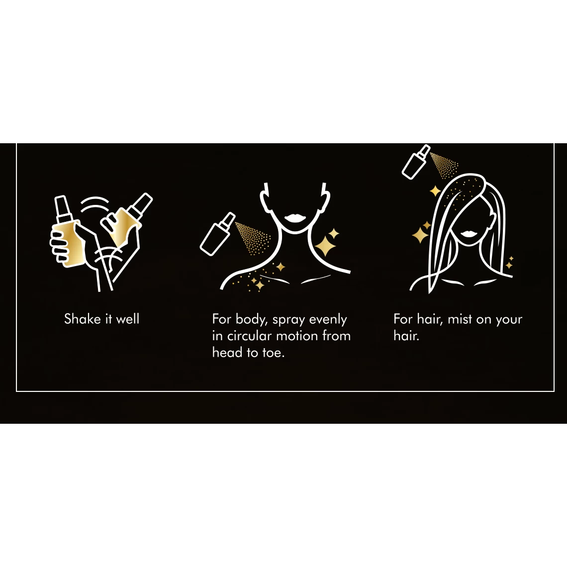 Shake Well. For body, spray evenly in sweeping motion from head to toe. For hair, spray from roots to ends.