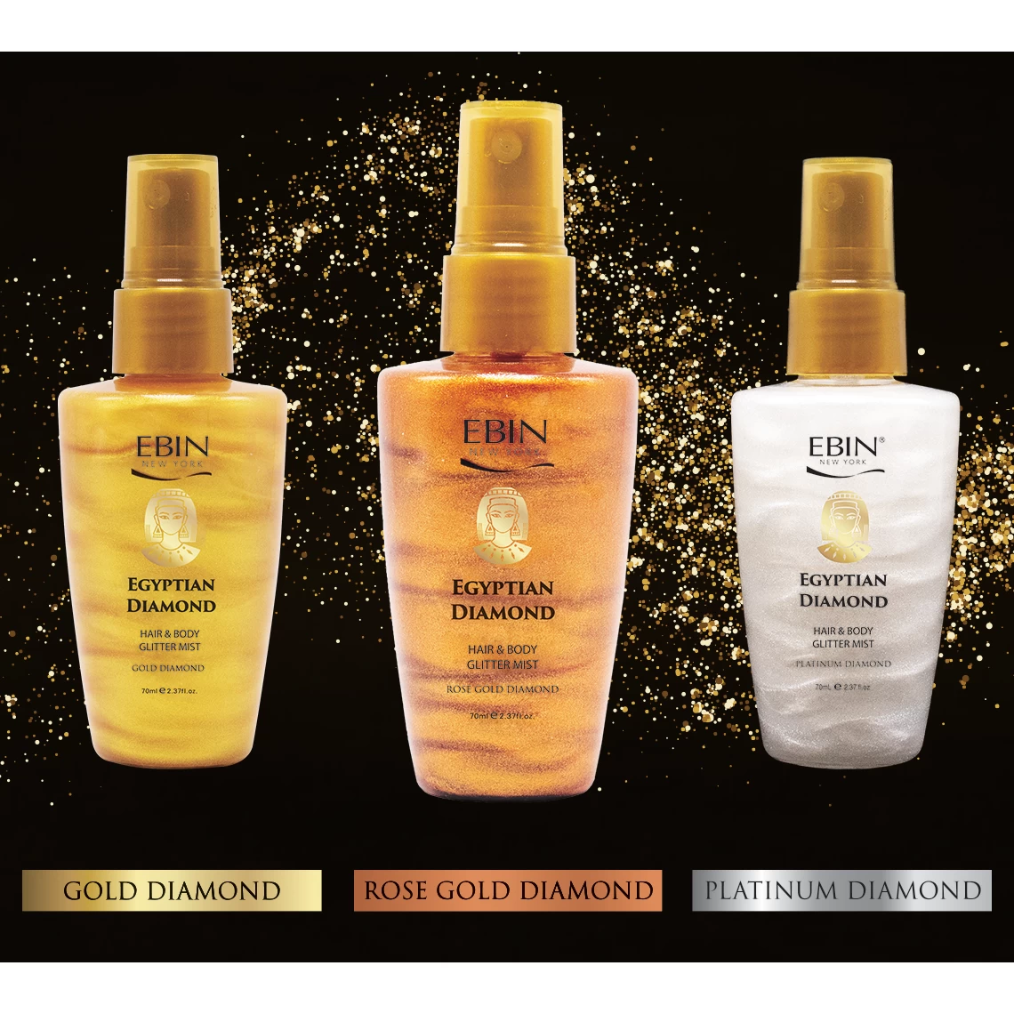 Shake up your glam routine with our Egyptian Diamond Hair & Body Glitter Mist Collection. From Gold, Rose Gold to Platinum Diamond, each formula will make your skin and hair illuminate with sparkles from head to toe. With Egyptian Diamond, You Glow Girl!
