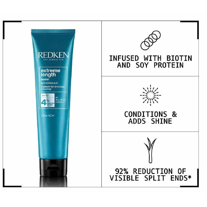 Redken: Redken Extreme Length Sealer Leave-In Conditioner with Redken’s Length Care Complex made with Biotin and Soy Protein helps hair growth by strengthening damaged hair to grow longer and stronger. Extreme Length Leave-In Conditioner also helps prevent hair breakage.